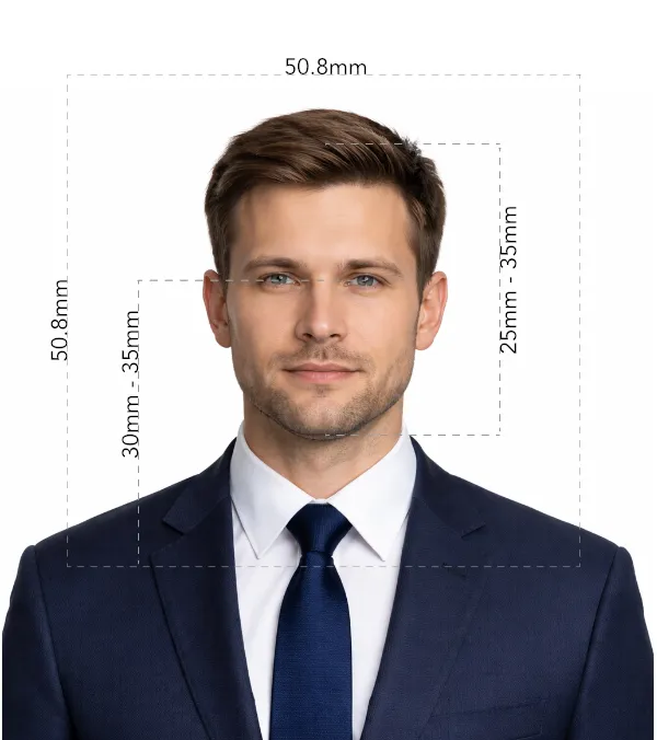 The official U.S. requirements specify a 2 x 2 inch (51 x 51 mm) photo, with the head measuring 1 inch to 1 3/8 inches (25 mm to 35 mm) from chin to top of head, on a plain white or off-white background.